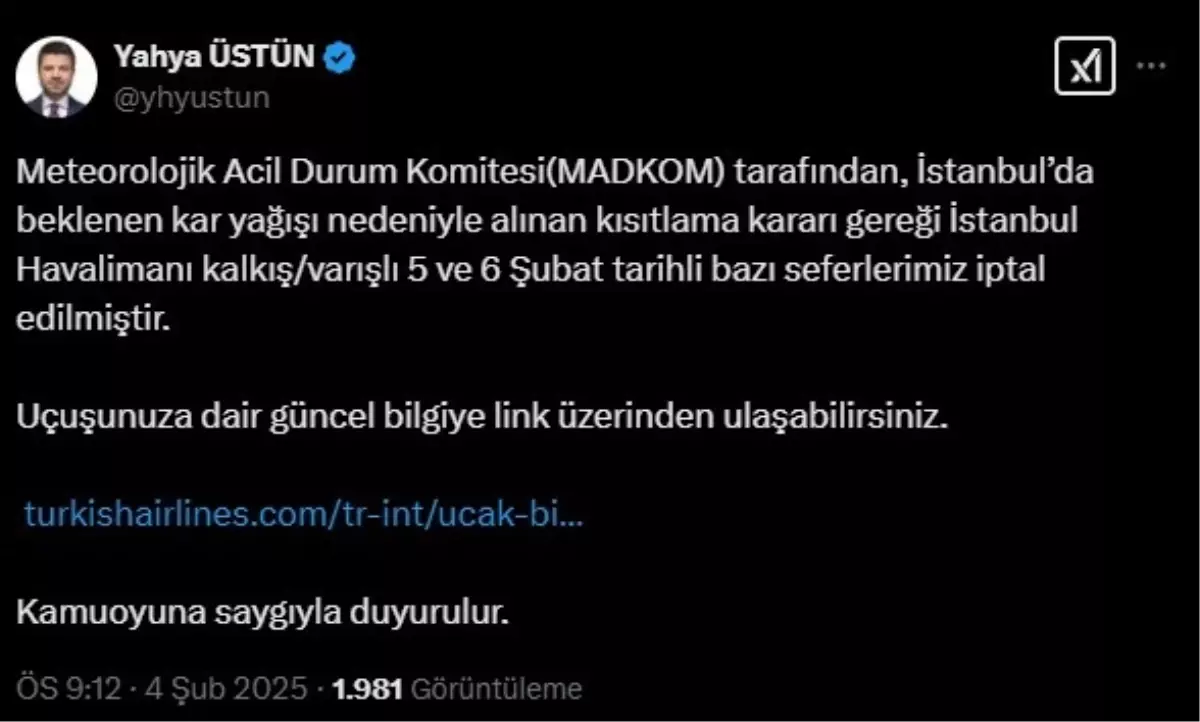 İSTANBUL’da beklenen olumsuz hava koşulları nedeniyle Türk Hava Yolları’nın İstanbul Havalimanı kalkışlı ve varışlı bazı seferleri iptal edildi. İstanbul’da beklenen…